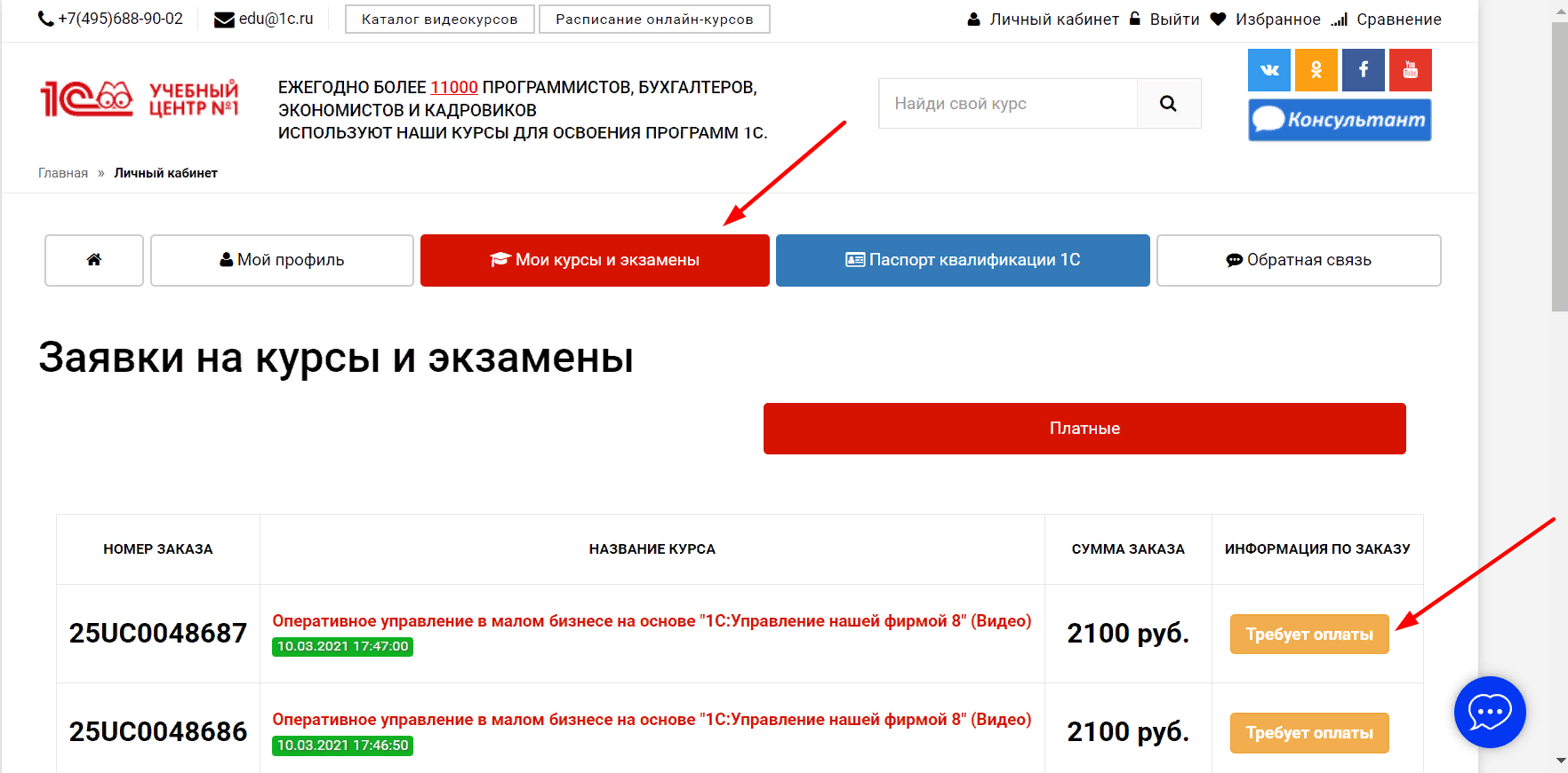 Необходимо войти в ЛК, перейти в раздел Мои курсы и экзамены и нажать на кнопку Требует оплаты